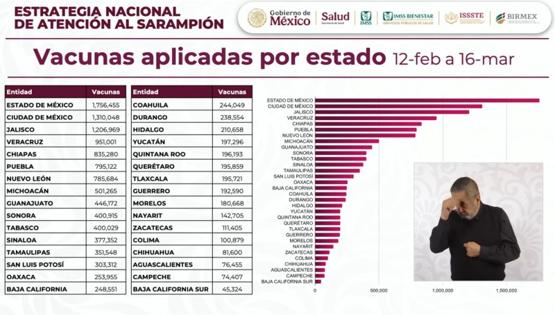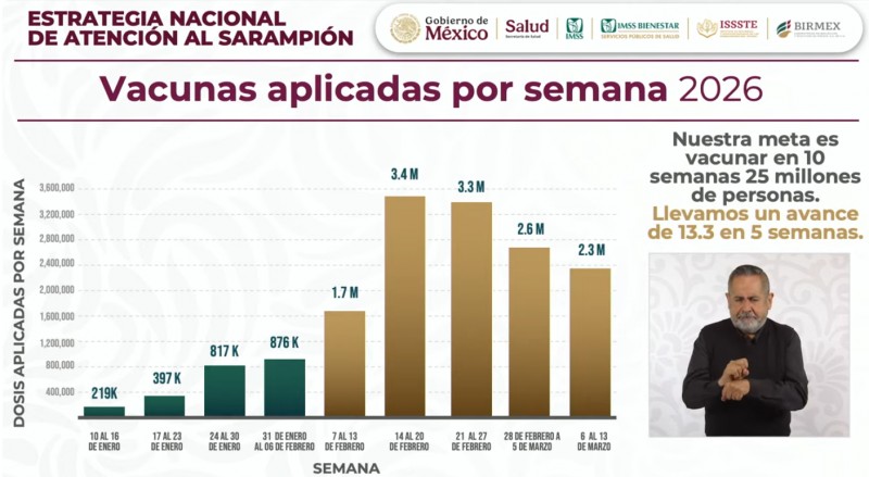 La Secretaría de Salud Federal, a través del subsecretario Eduardo Clark, informó que la campaña nacional de vacunación contra el sarampión registra un avance significativo con 13.3 millones de personas inmunizadas en apenas cinco semanas.