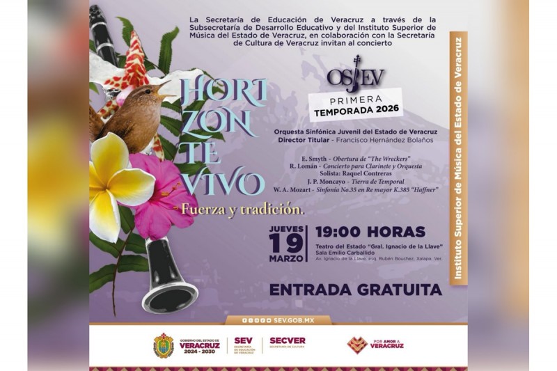La Secretaría de Educación de Veracruz, en colaboración con la Secretaría de Cultura de Veracruz, invitan al Primer Concierto de la Temporada 2026 de la Orquesta Sinfónica Juvenil del Estado de Veracruz (OSJEV), titulado Horizonte Vivo: Fuerza y Tradición, que se realizará el próximo jueves 19 de marzo a las 19:00 horas.