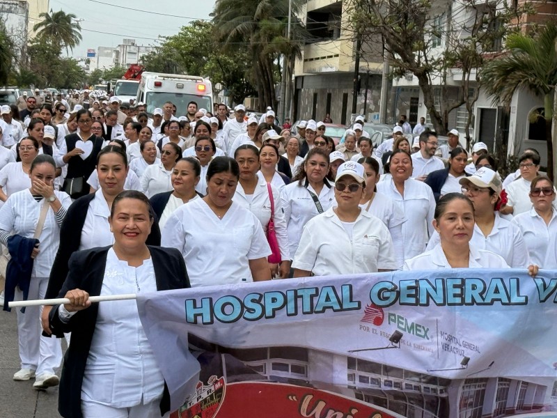 Durante el desfile realizado sobre la avenida Miguel Alemán, a la altura de las oficinas de la Sección 9, empleados petroleros marcharon acompañados de unidades de la empresa y turibuses, mientras portaban cartulinas en las que exigían médicos, medicinas y mejores condiciones de seguridad laboral.