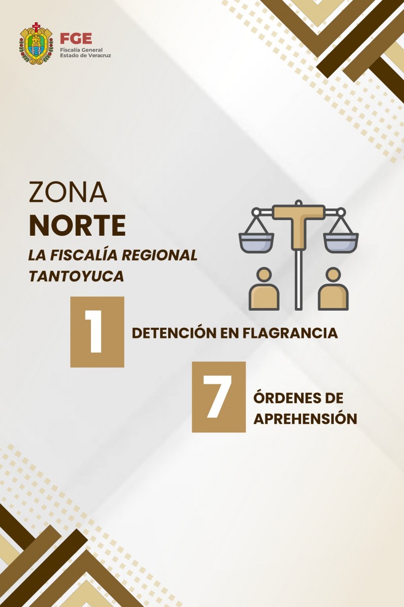 Dentro de la zona norte, se reportó 1 detención en flagrancia y el cumplimiento de 7 órdenes de aprehensión por parte de la Fiscalía Regional Tantoyuca, mientras que la Fiscalía Regional Tuxpan llevó a cabo 13 detenciones en flagrancia y ejecutó 9 órdenes de aprehensión.