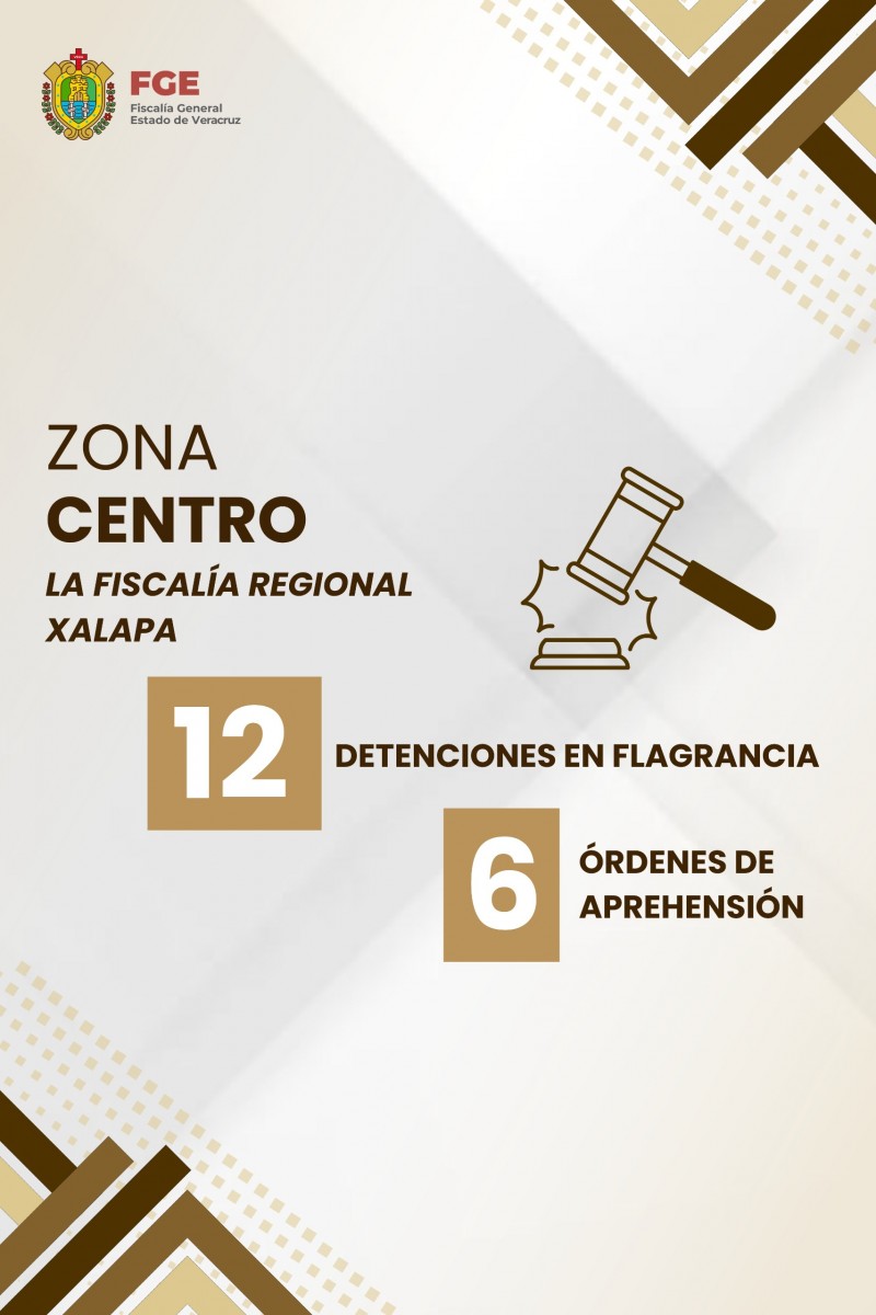 Aunado a ello, se suman las 12 detenciones en flagrancia y 6 órdenes de aprehensión comunicadas por la Fiscalía Regional Xalapa, así como las reportadas por la Fiscalía Regional Cosamaloapan, la cual efectuó 6 detenciones en flagrancia y la ejecución de 5 órdenes de aprehensión.