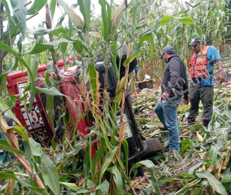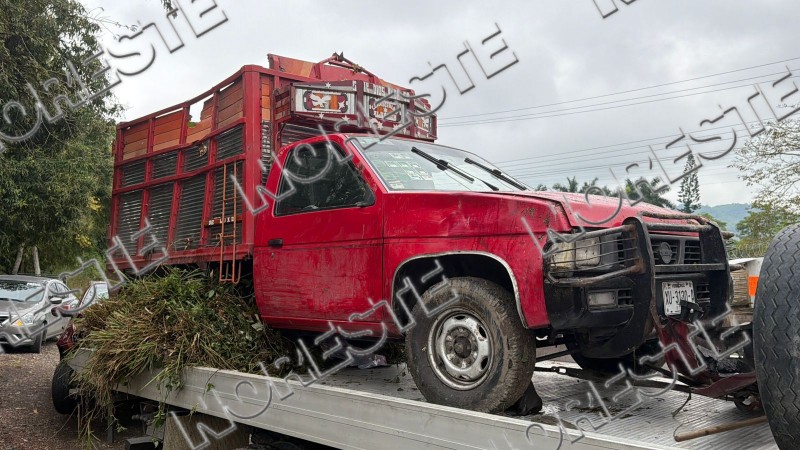 De acuerdo con los primeros reportes, un automóvil Chevrolet Aveo color rojo se impactó contra una camioneta Nissan NP300 de redilas que transportaba cajas de frutas y verduras. Tras la colisión, ambas unidades salieron de la cinta asfáltica y terminaron en el fondo de un barranco, resultando con severos daños materiales.