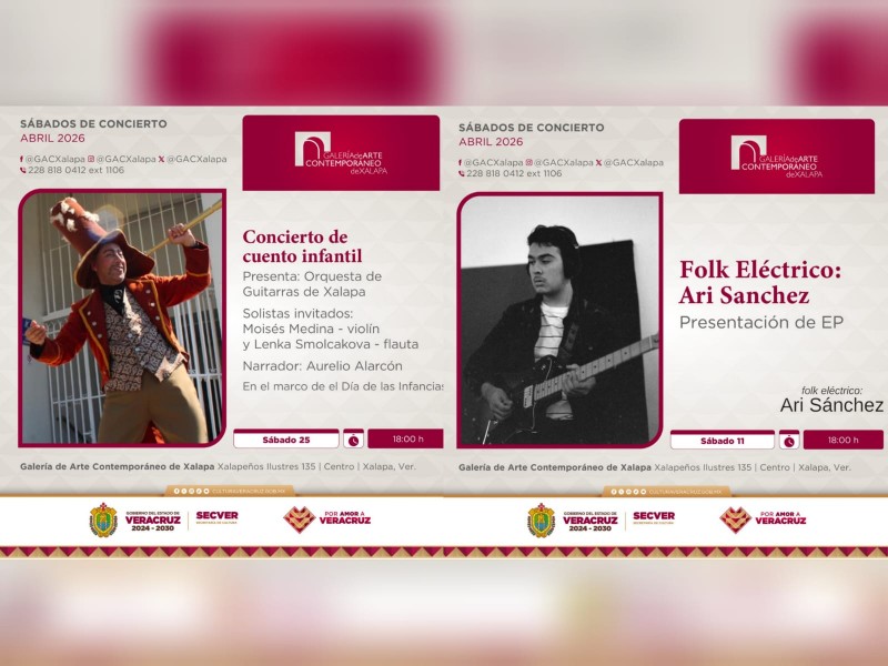 Las secretarías de Cultura y de Educación de Veracruz, invitan a los sábados de concierto, los días 11 y 25 de abril a las 18:00 horas, en la Galería de Arte Contemporáneo de Xalapa. La entrada es gratuita.