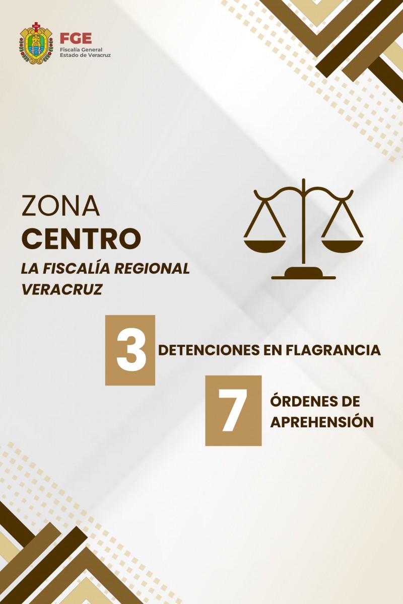 Asimismo, en la zona centro, la Fiscalía Regional Veracruz concretó 3 detenciones en flagrancia y cumplimentó 7 órdenes de aprehensión; en tanto que la Fiscalía Regional Córdoba registró 8 detenciones en flagrancia y ejecutó 8 órdenes.