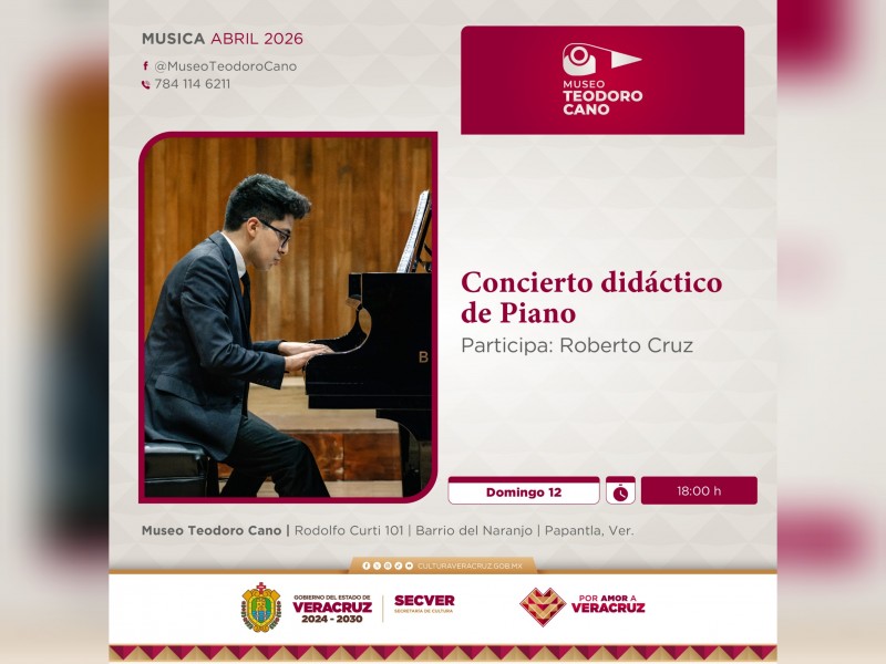 La Secretaría de Cultura de Veracruz (SECVER) invita al público a disfrutar del Concierto didáctico de piano, que se llevará a cabo el domingo 12 de abril, a las 18:00 horas, en el Auditorio del Museo Teodoro Cano, en Papantla. La entrada es gratuita.