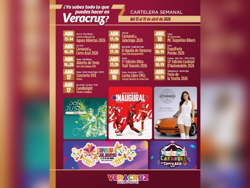 Asimismo, del 17 al 19 de abril, en Jalacingo, tendrá lugar el Carnaval de Jalacingo 2026, y en el estadio Beto Ávila, en Boca del Río, El Águila de Veracruz disputará la Gran Serie Inaugural de la MLB.