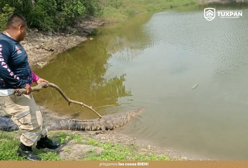 La oportuna intervención de elementos de Protección Civil y Bomberos de Tuxpan permitió el aseguramiento de un cocodrilo que fue reportado deambulando en la vía pública, en el libramiento Adolfo López Mateos, a la altura de la colonia Ampliación Rodríguez Cano.