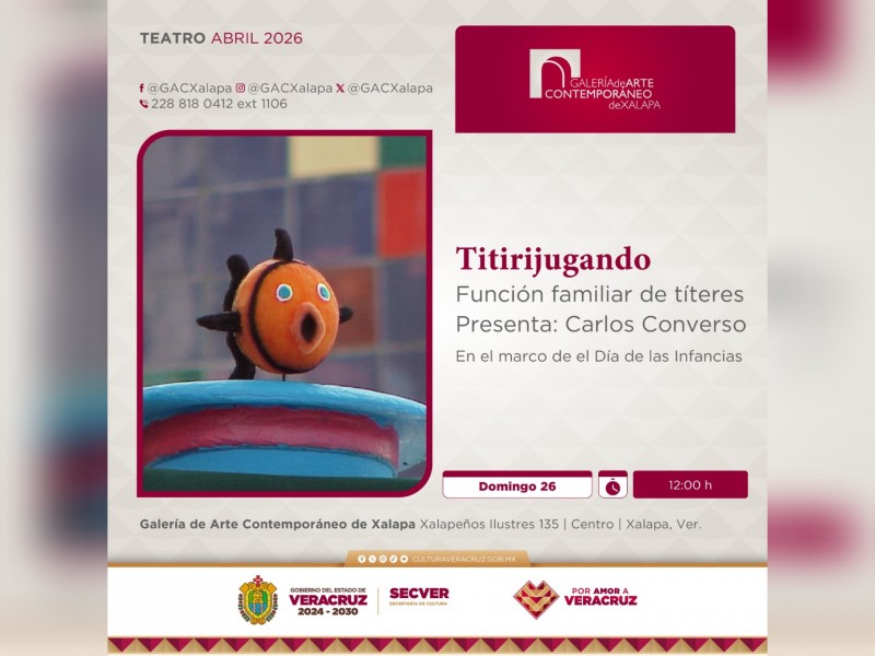 En el marco de las celebraciones por el Día de las Infancias, la Secretaría de Cultura de Veracruz invita a la presentación de la obra teatral Titirijugando, del maestro Carlos Converso. La función se llevará a cabo el domingo 26 de abril a las 12:00 horas en la Galería de Arte Contemporáneo de Xalapa. La entrada es gratuita.