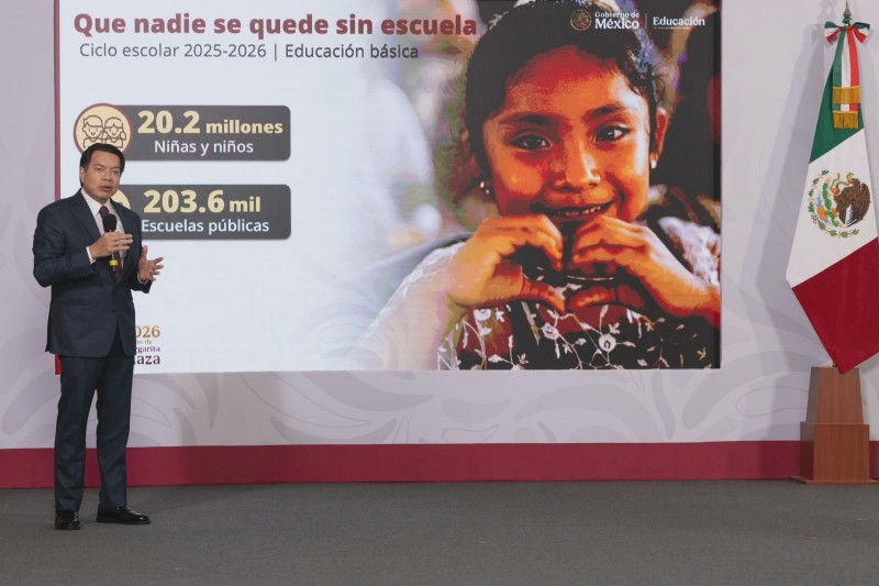El secretario de Educación Pública, Mario Delgado Carrillo explicó que el Gobierno de México implementa programas, fortalece la infraestructura y realiza acciones en beneficio de 20.2 millones de niñas y niños inscritos en 203 mil 600 escuelas públicas, como: