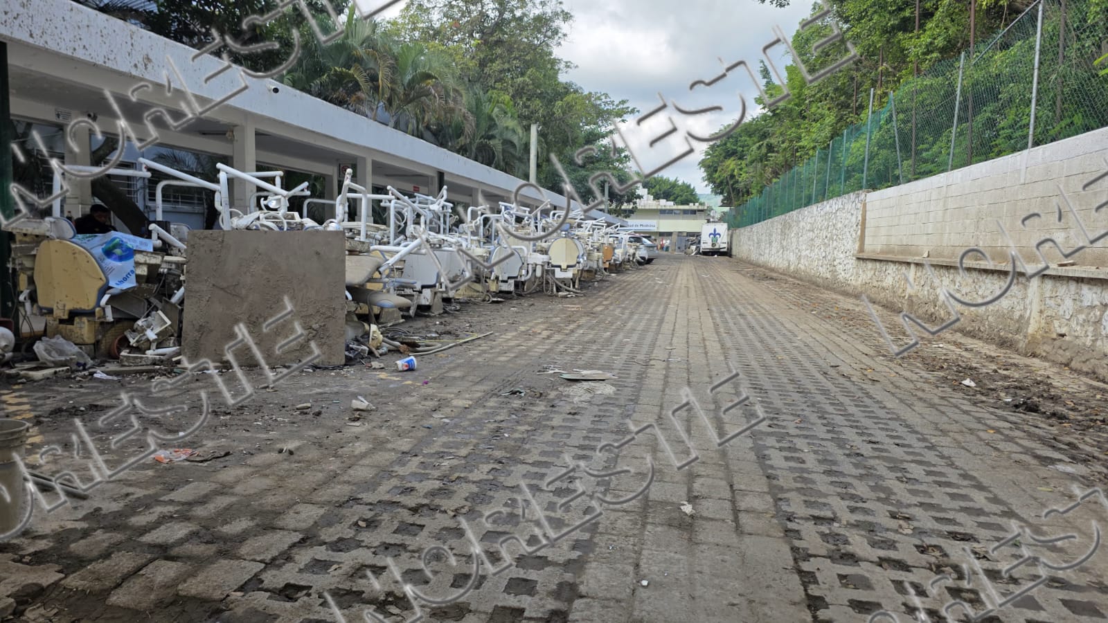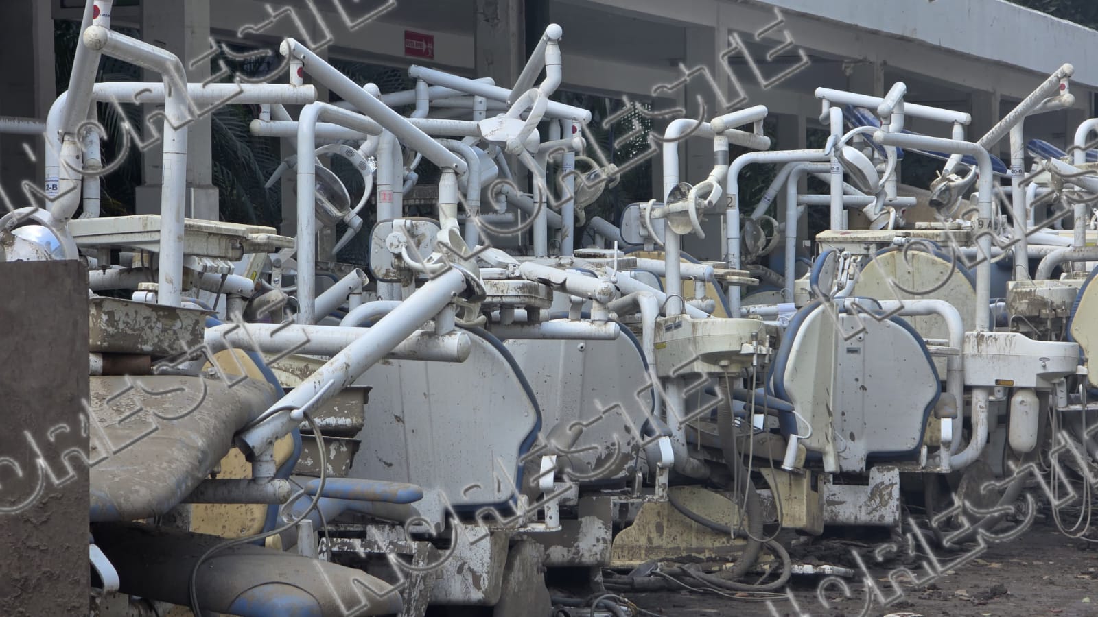 Durante el recorrido realizado por las brigadas internas se confirmó que los consultorios, laboratorios y áreas clínicas resultaron severamente afectados. Sillones profesionales, piezas de mano, lámparas de fotocurado, mobiliario clínico y material médico fueron colocados en el acceso principal de la facultad debido a que el agua los dañó por completo, impidiendo cualquier posibilidad de recuperación.
