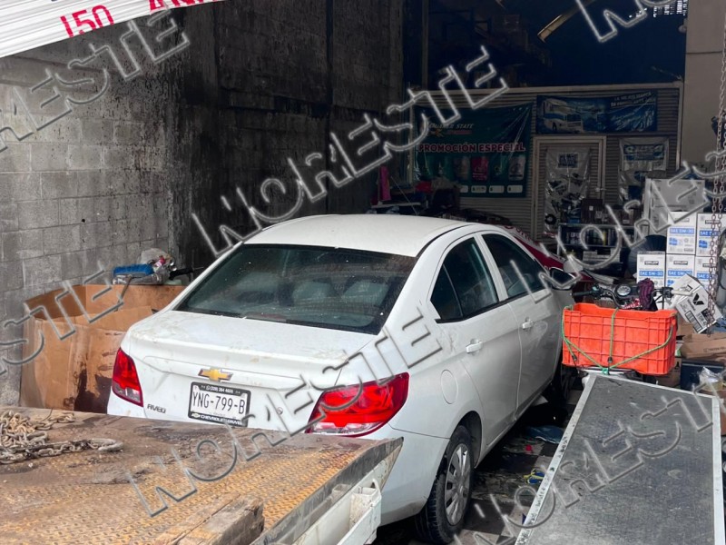 Tras el impacto lateral, la conductora del Chevrolet perdió el control del volante y avanzó varios metros hasta estrellarse contra la bodega de un negocio de autopartes, derribando la cortina de acero y causando daños materiales considerables.