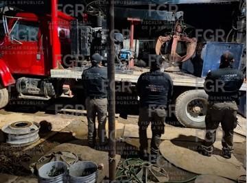 Durante la inspección también fueron asegurados dos camiones tipo grúa, una máquina tipo trascabo, bidones de diferentes capacidades, autopartes diversas y placas metálicas con la leyenda de Petróleos Mexicanos.