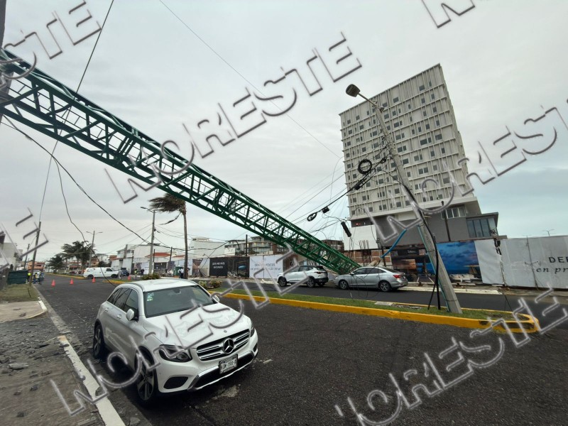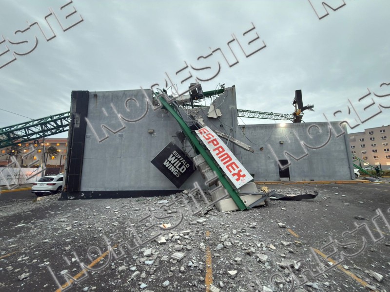 Una grúa de construcción de gran altura cayó sobre un negocio en Boca del Río debido a las fuertes rachas de viento generadas por el frente frío número 25.