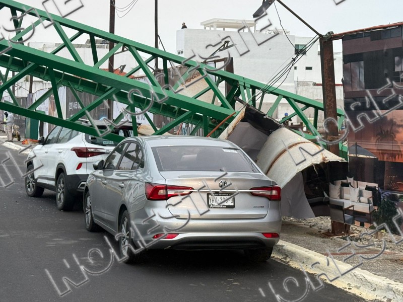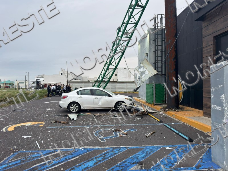 La estructura metálica destrozó la fachada del lugar, así como anuncios espectaculares y otras instalaciones; además de que dañó algunos vehículos que se encontraban en el sitio.