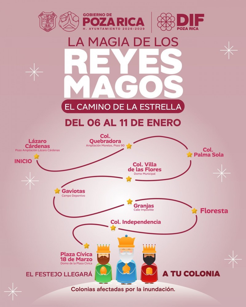 El Sistema Municipal para el Desarrollo Integral de la Familia, que dirige la Licenciada Stephany Paola Mar Segura, en coordinación con el Gobierno de Poza Rica, que encabeza la Presidenta Municipal Janeth Adanely Rodríguez Rodríguez, prepara una serie de festejos para celebrar "La magia de los Reyes Magos", llevando sorpresas, alegría y diversión a la niñez pozaricense.