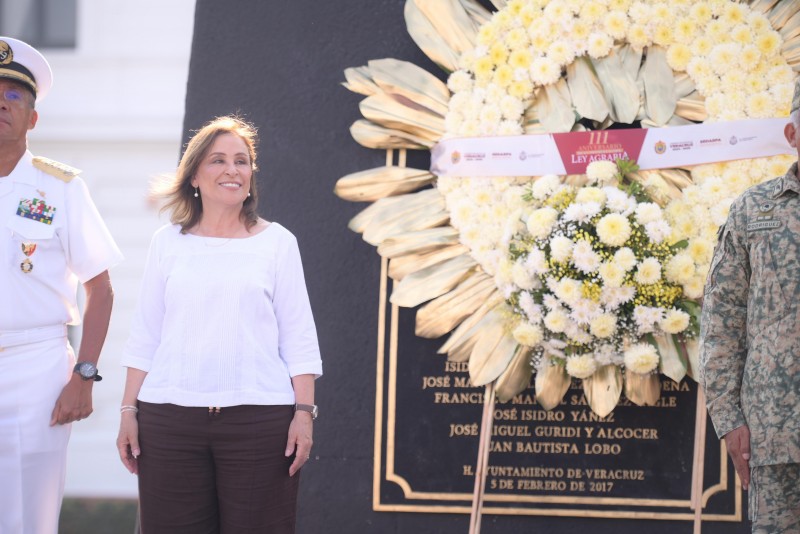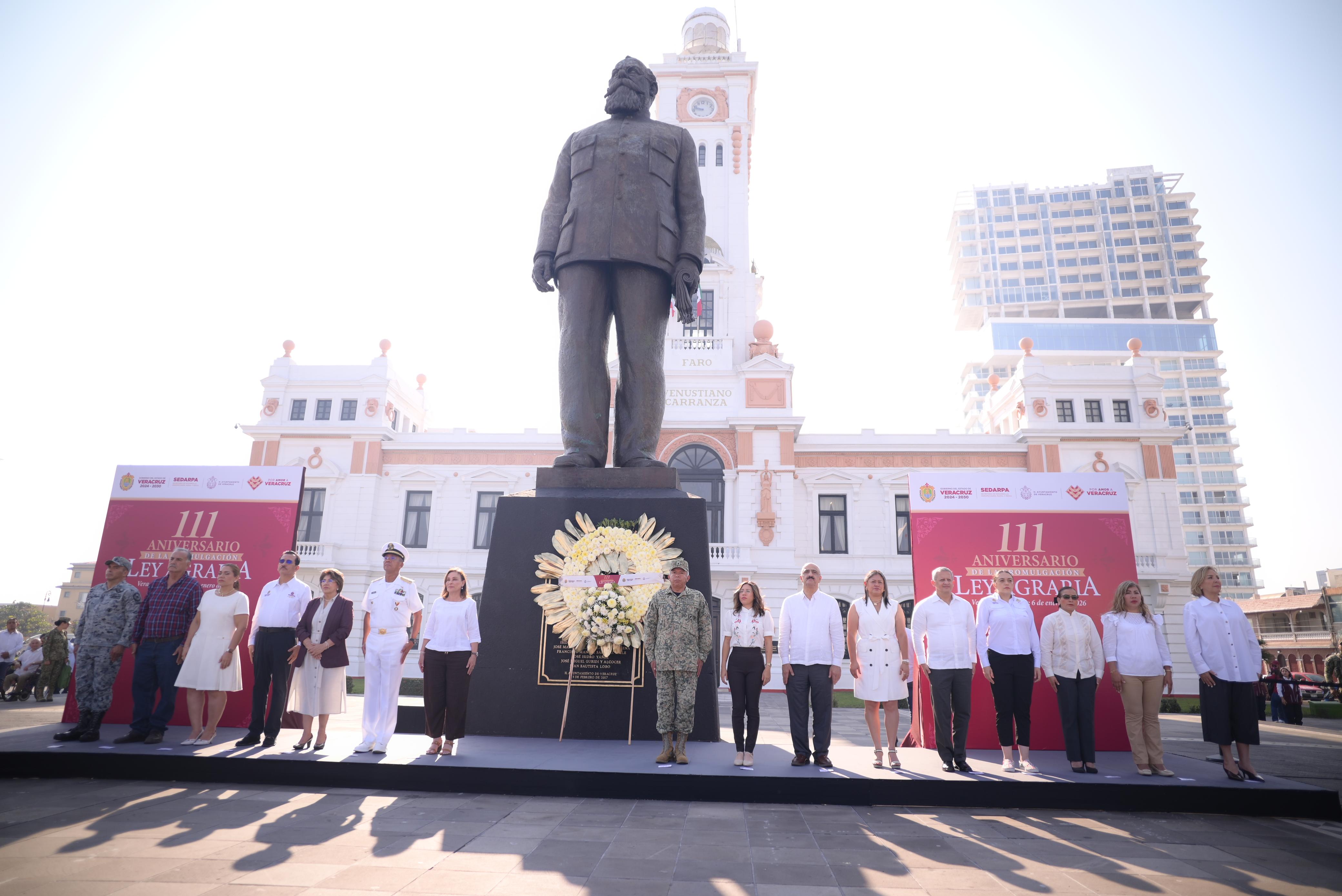 Con una guardia de honor y el depósito de ofrenda floral ante el monumento a Venustiano Carranza, la gobernadora Rocío Nahle García, junto con autoridades de los tres órdenes de gobierno, conmemoró el 111 aniversario de la promulgación de la Ley Agraria.