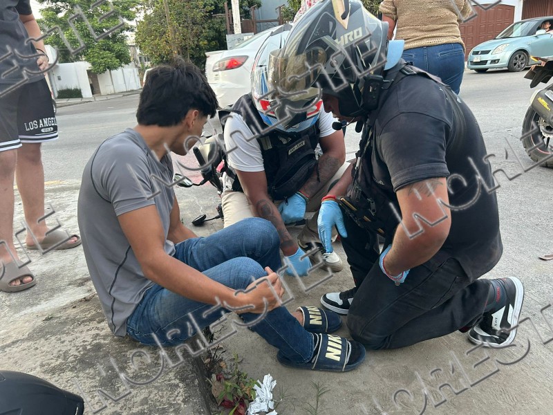 Un accidente automovilístico se registró en la avenida Pozo 13 esquina con calle Zapote de la colonia Chapultepec, donde un motociclista resultó lesionado al impactar contra la puerta lateral de una camioneta Jac. El motociclista sufrió una lesión en el pie izquierdo y fue valorado por paramédicos de Cruz Ámbar, quienes llegaron al lugar como primer contacto.