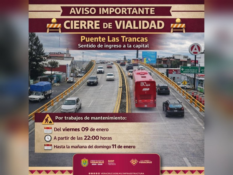 La Secretaría de Infraestructura y Obras Públicas (SIOP) informa que, debido a trabajos de mantenimiento, se realizará el cierre del puente Las Trancas en el sentido de ingreso a la ciudad de Xalapa, a partir de las 22:00 horas de este viernes y hasta la mañana del domingo 11 de enero.