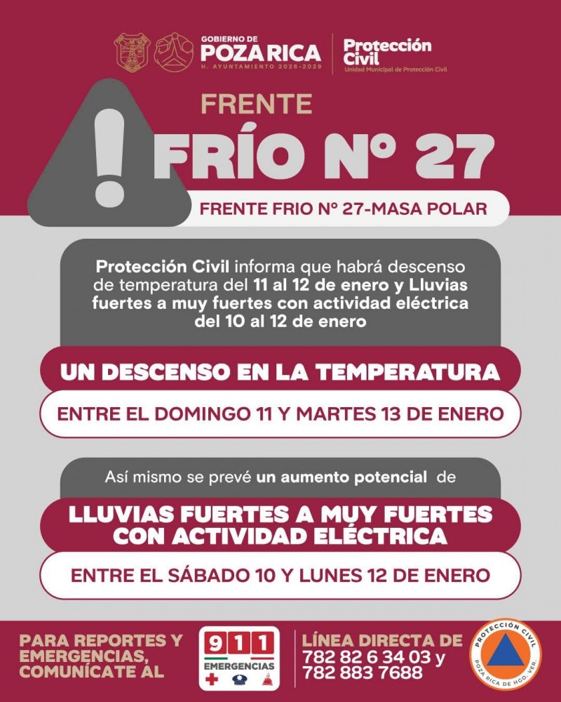 Poza Rica se prepara para enfrentar un escenario climático complicado con el ingreso del frente frío número 27, el cual vendrá acompañado de una masa de aire polar que provocará cambios drásticos en el clima durante los próximos días, advirtió la Unidad Municipal de Protección Civil.