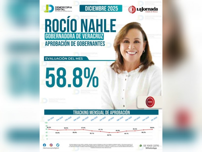 La administración estatal encabezada por Rocío Nahle García cierra el año con una tendencia favorable en la percepción pública. De acuerdo con el más reciente informe de la encuestadora Demoscopia Digital, la gobernadora de Veracruz alcanzó un 58.8% de aprobación ciudadana al finalizar diciembre de 2025.