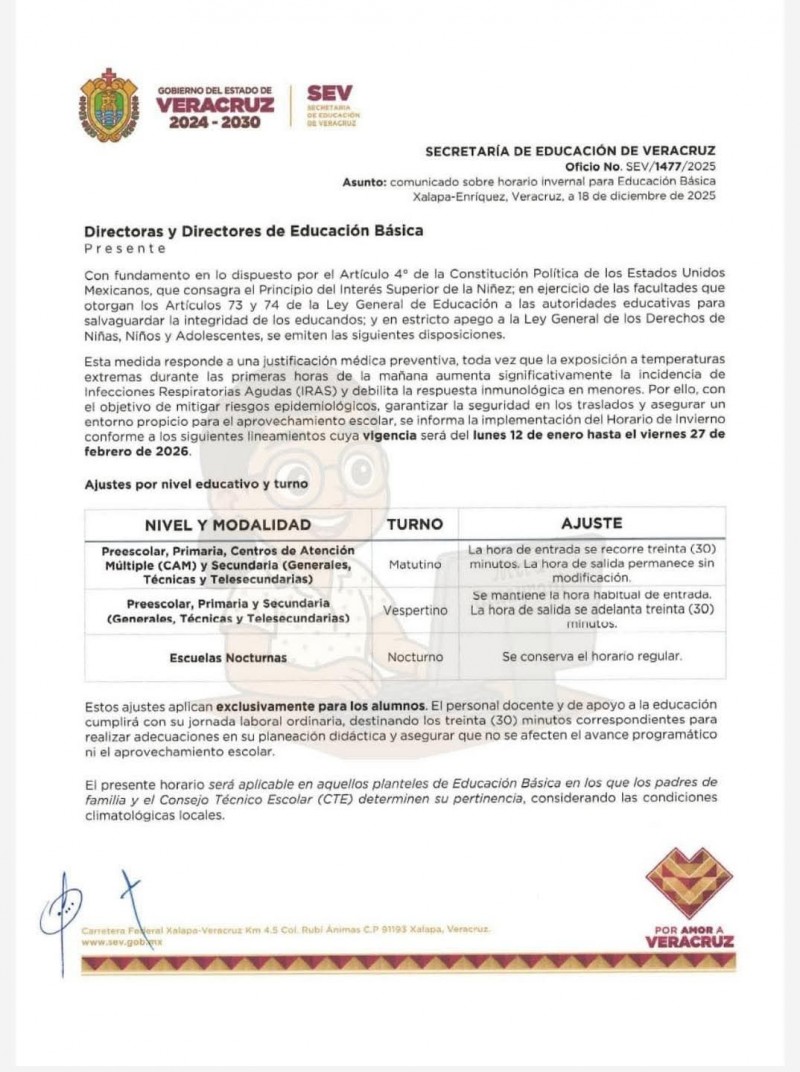 Con el objetivo de salvaguardar la integridad física de la comunidad estudiantil y mitigar el riesgo de infecciones respiratorias agudas, la Secretaría de Educación de Veracruz (SEV) anunció la activación oficial del Horario de Invierno para el ciclo escolar 2025-2026.