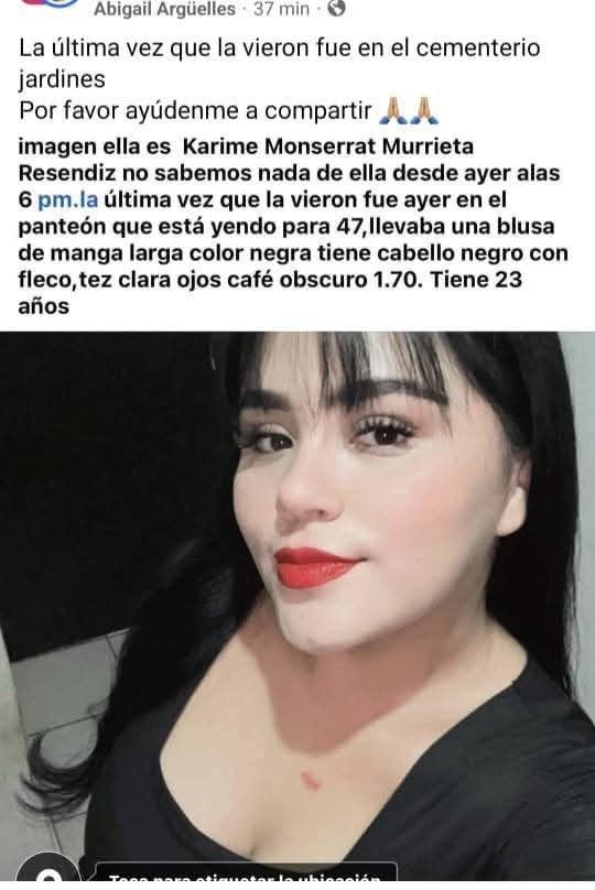 El segundo caso es el de Karime Monserrat Murrieta Reséndiz, también de 23 años, quien fue vista por última vez ayer alrededor de las 6:00 de la tarde en el Cementerio Jardines, ubicado rumbo a la colonia 47; mide aproximadamente 1.70 metros, es de tez clara, tiene ojos café oscuro y cabello negro con fleco, y al momento de su desaparición vestía una blusa de manga larga color negro.