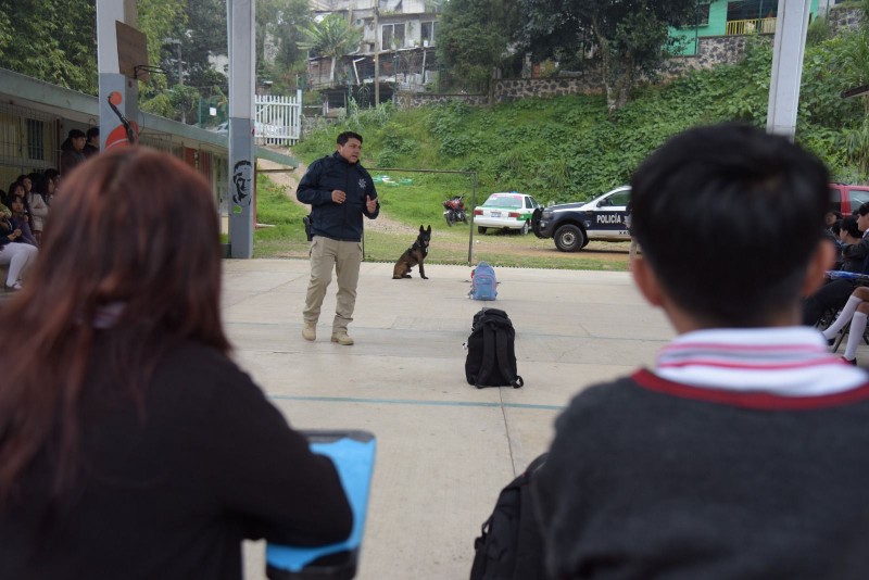 Además, se contó con la colaboración de un elemento canino y un oficial adscrito a la Brigada Animal de la Policía, quien expuso el manejo, control básico y avanzado del binomio, así como las habilidades de obediencia, socialización y trabajo en entornos escolares.