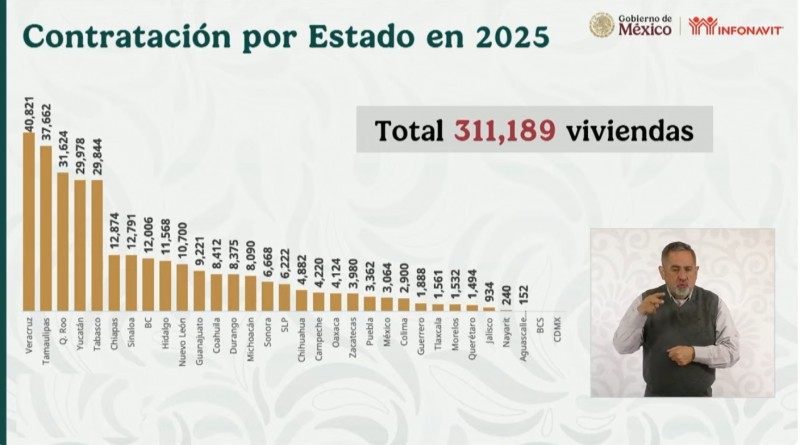 Según el balance presentado, 2025 cerró con 311 mil viviendas contratadas, liderando la lista estados como Veracruz, Tamaulipas, Quintana Roo y Yucatán.