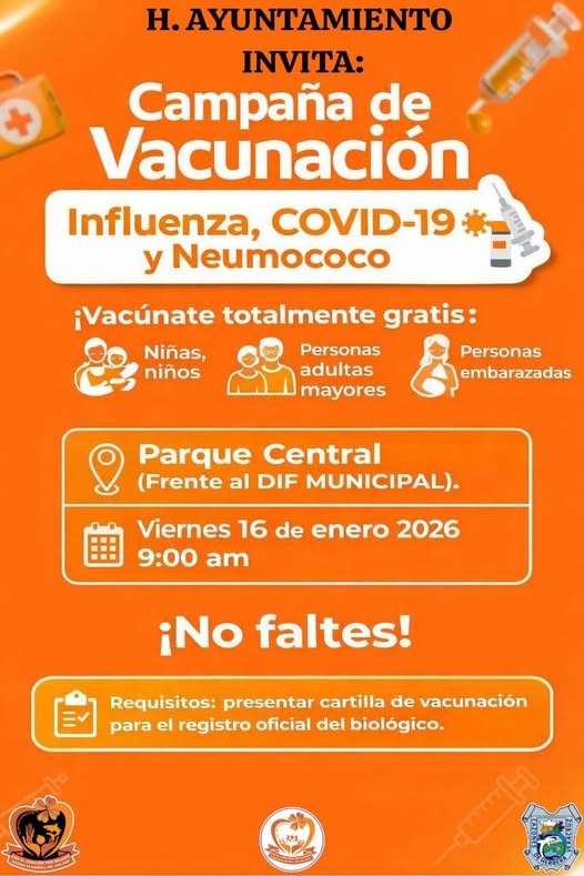 La actividad se llevará a cabo el viernes 16 de enero de 2026, a partir de las 9:00 de la mañana, en el Parque Central, ubicado frente al DIF Municipal. Las autoridades informaron que es indispensable presentar la cartilla de vacunación, ya que será requerida para el registro oficial de cada biológico aplicado.