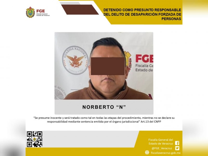 La Fiscalía General del Estado informa que, elementos de la Policía Ministerial dieron cumplimiento a una orden de aprehensión en contra de Norberto “N”, como presunto responsable del delito de desaparición forzada de personas, cometido en agravio de una víctima cuya identidad se encuentra debidamente resguardada.