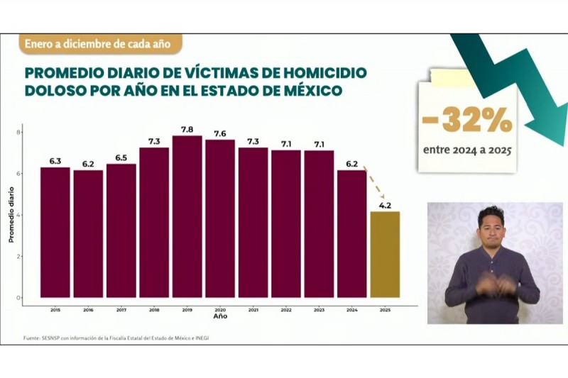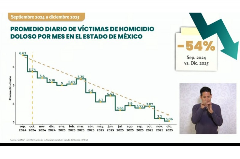 El Estado de México ha alcanzado niveles mínimos históricos en la incidencia de delitos de alto impacto. De acuerdo con el reporte oficial de la Secretaría Ejecutiva del Sistema Nacional de Seguridad Pública (SESNSP), la entidad registró una disminución del 54% en el promedio diario de homicidios dolosos durante el periodo comprendido entre septiembre de 2024 y diciembre de 2025.