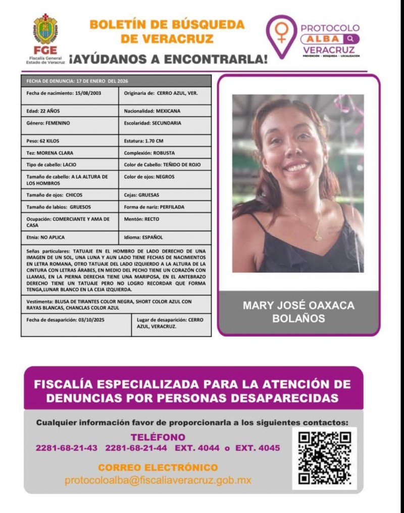 La Fiscalía General del Estado de Veracruz (FGE) emitió un Boletín de Búsqueda y activó el Protocolo Alba para localizar a Mary José Oaxaca Bolaños, de 22 años de edad, reportada como desaparecida en el municipio de Cerro Azul, Veracruz.
