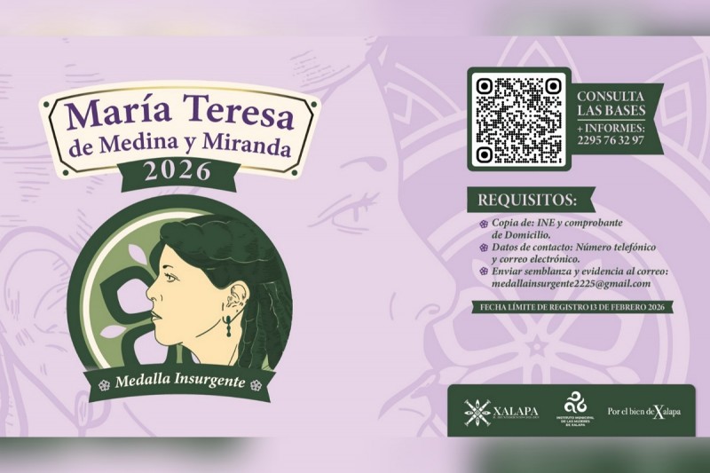 Con el fin de reconocer la trayectoria y trabajo en favor de la igualdad de género, la promoción y la defensa de los derechos de las mujeres, el Ayuntamiento, a través del Instituto Municipal de las Mujeres de Xalapa (IMMX), invita a la ciudadanía a participar en la convocatoria de la medalla insurgente “María Teresa de Medina y Miranda 2026”.