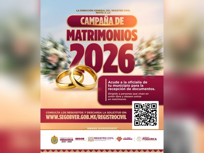 La campaña está dirigida a personas interesadas en contraer matrimonio, quienes deberán acudir a la oficialía del Registro Civil de Poza Rica para la recepción de documentos, conforme a las bases establecidas por la autoridad estatal.
