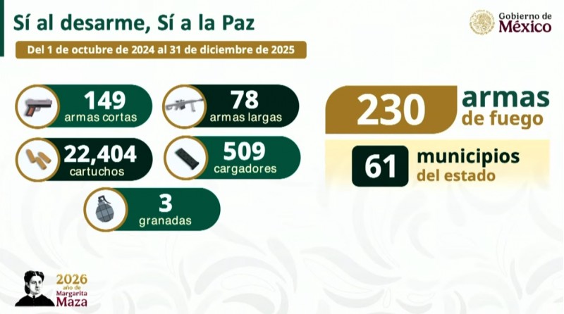 Durante el balance de esta estrategia nacional, la funcionaria informó que se logró la captación de 230 artefactos bélicos en un total de 61 municipios de la entidad. El programa opera bajo un esquema de intercambio anónimo y voluntario, donde los ciudadanos entregan armas de fuego a cambio de incentivos económicos en efectivo, sin que se inicie ninguna investigación legal en su contra.