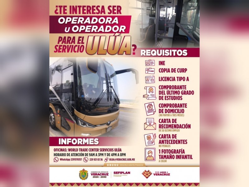 En un paso decisivo hacia la transformación de la movilidad en la entidad, el Gobierno del Estado de Veracruz, a través de la Secretaría de Finanzas y Planeación (SEFIPLAN), anunció formalmente la convocatoria para reclutar a las y los operadores del nuevo sistema de transporte público denominado "Ulúa".