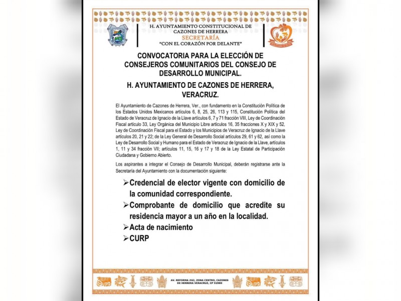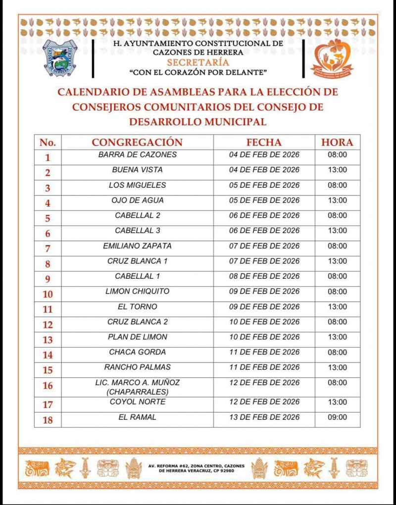 Con el objetivo de fortalecer la participación ciudadana y consolidar un gobierno cercano a la gente, el Honorable H. Ayuntamiento de Cazones, que preside el ciudadano Humberto Olvera Torres, invita a la población a participar activamente en la elección de Consejeras y Consejeros Comunitarios, quienes integrarán el Consejo de Desarrollo Municipal.