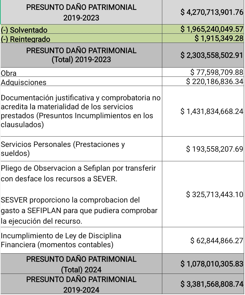 La suma de las observaciones documentadas por la ASF arroja un presunto daño patrimonial histórico superior a los 2 mil 300 millones de pesos, concentrado en el periodo en que Jorge Sisniega Fernández tuvo bajo su responsabilidad la administración financiera de los Servicios de Salud de Veracruz.