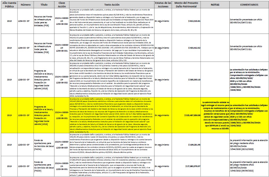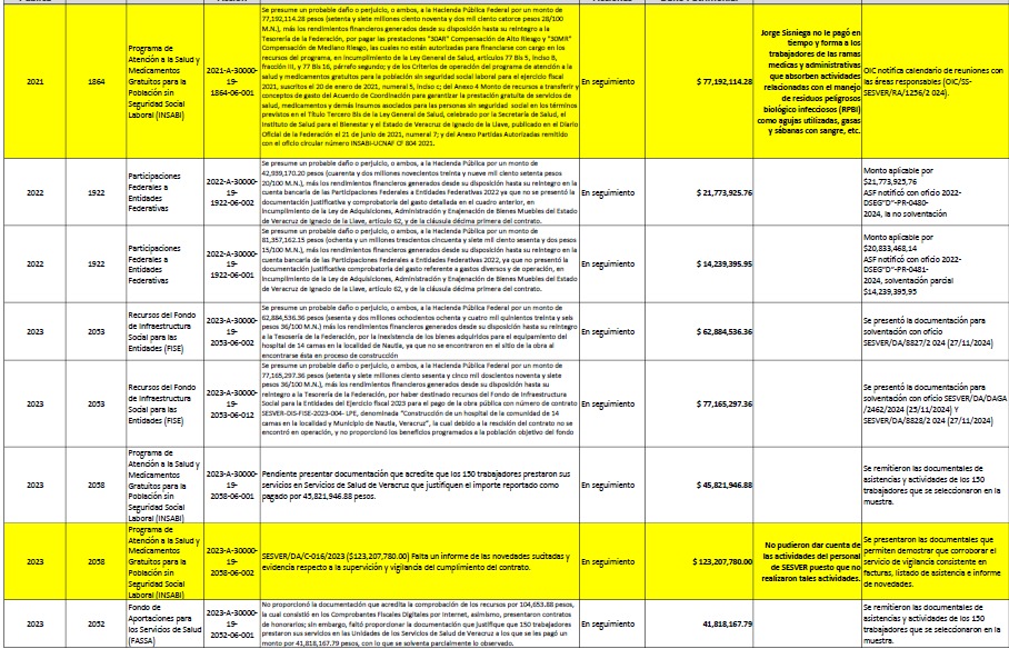 Uno de los hallazgos más graves corresponde al ejercicio 2023, cuando 325 millones 407 mil 850 pesos destinados a la compra de medicamentos e insumos médicos no fueron entregados a SESVER, a pesar de haber sido recibidos por el Gobierno del Estado.