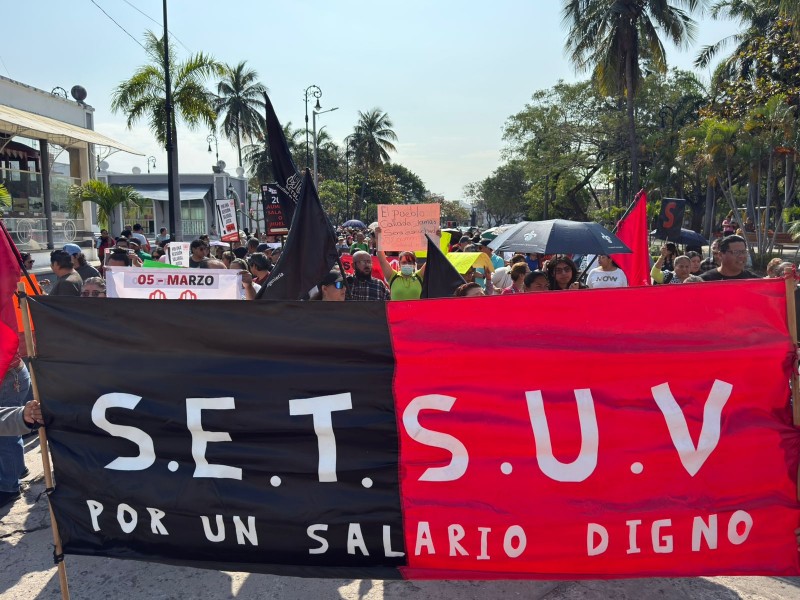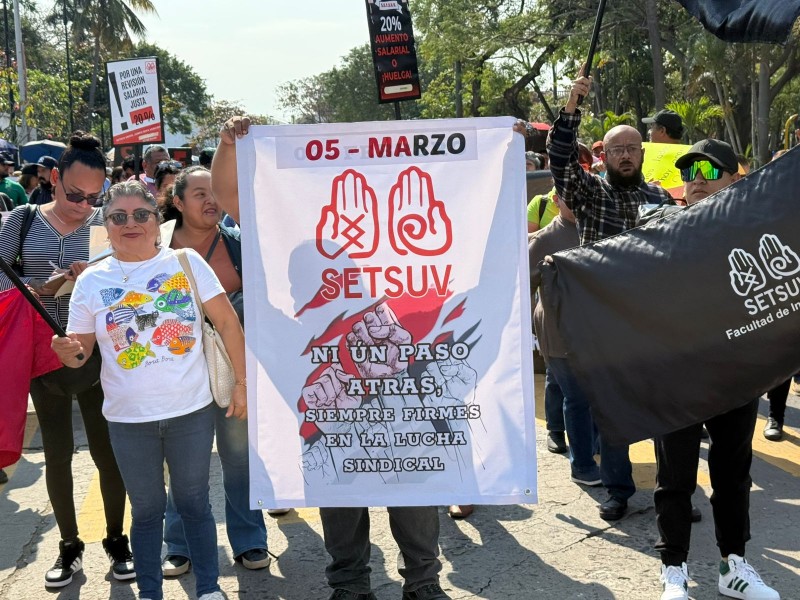 Integrantes del Sindicato Estatal de Trabajadores al Servicio de la Universidad Veracruzana se manifestaron este miércoles 4 de febrero para exigir un aumento salarial del 20 por ciento.