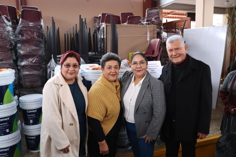 La entrega consistió en 92 cubetas de pintura, 118 de impermeabilizante, 10 brochas, 10 rodillos, 330 sillas y 165 mesas trapezoidales, 21 pizarrones y 33 pantallas de 55 pulgadas a las escuelas CAPEP Jean Piaget y la primaria Ricardo Flores Magón.