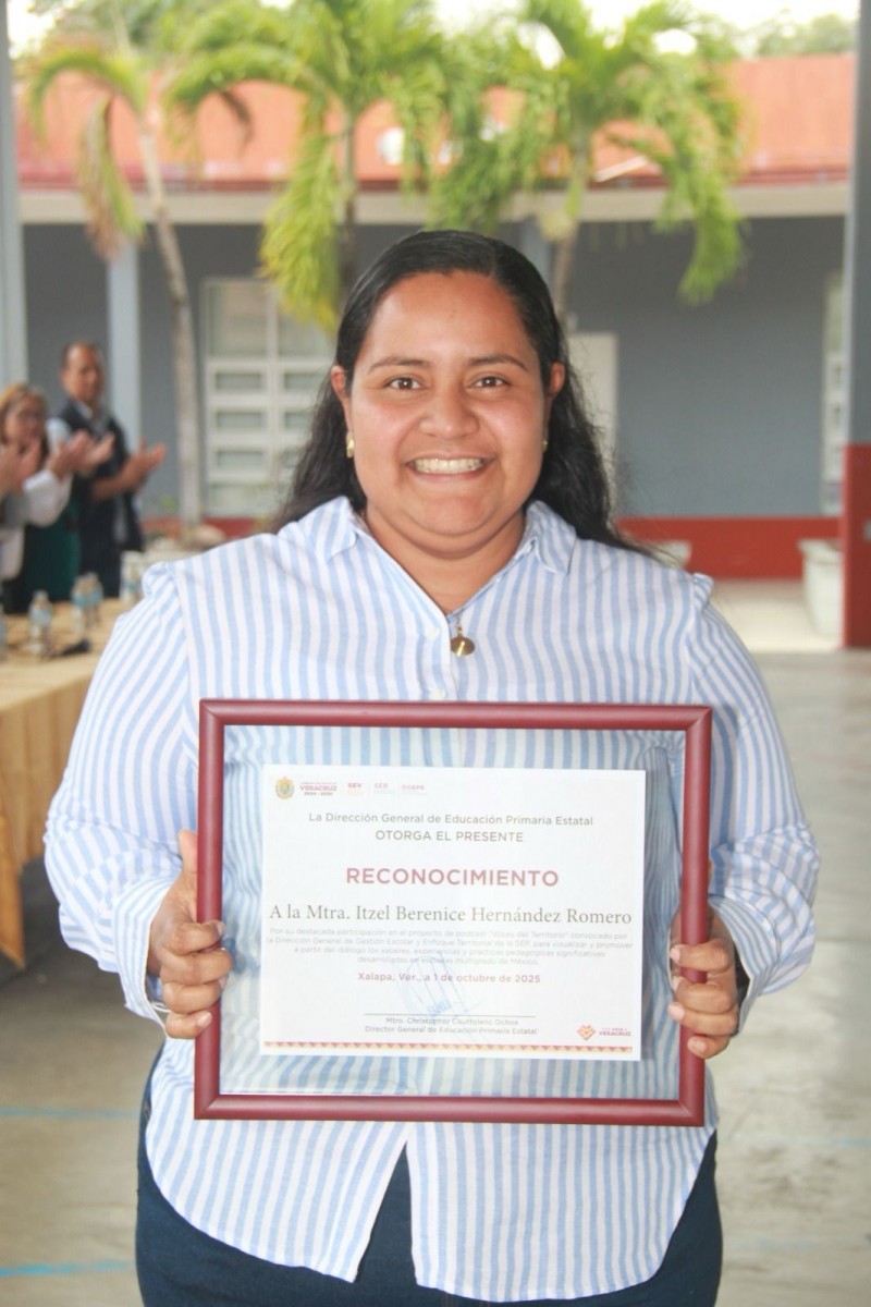 La Secretaría de Educación de Veracruz (SEV), a través de la Dirección General de Educación Primaria Estatal, otorgó un reconocimiento a la maestra Itzel Berenice Hernández Romero, adscrita a la Escuela Primaria Guillermo Prieto, ubicada en la localidad de Los Teteles, por su destacada participación en el podcast Voces del Territorio.