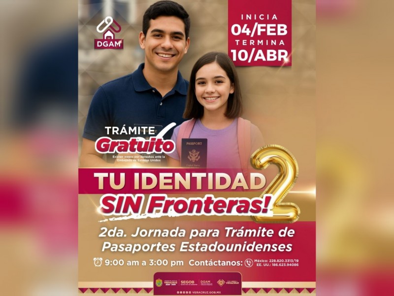 La Secretaría de Gobierno, a través de la Dirección General de Atención a Migrantes, inició la 2ª Jornada de Trámite de Pasaporte Estadounidense Tu Identidad sin Fronteras, dirigida a personas nacidas en Estados Unidos, hijas e hijos de padres mexicanos que residen en Veracruz, del 04 de febrero al 10 de abril del año en curso.