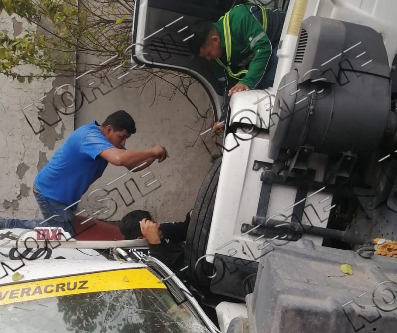 Posteriormente, el camión terminó su carrera aplastando materialmente al taxi marcado con el número económico 5004 VB.