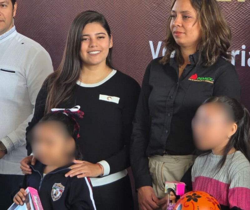 La presidenta municipal Adanely Rodríguez Rodríguez y la presidenta honoraria del Voluntariado de Petróleos Mexicanos (Pemex), María Felicia Jiménez Lavie, realizaron la entrega de juguetes a niñas y niños de la Escuela Miguel Alemán Valdés, generando sonrisas y momentos de alegría entre la comunidad estudiantil.