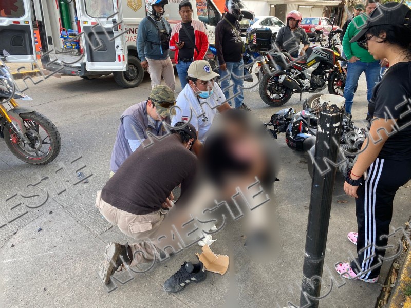 El motociclista resultó derribado y sufrió lesiones considerables, así como fuertes dolores musculares en ambas piernas. Paramédicos de Cruz Ámbar Primer Contacto llegaron al sitio para brindar los primeros auxilios y posteriormente, Salud Municipal realizó el traslado del lesionado a una clínica para recibir atención médica.
