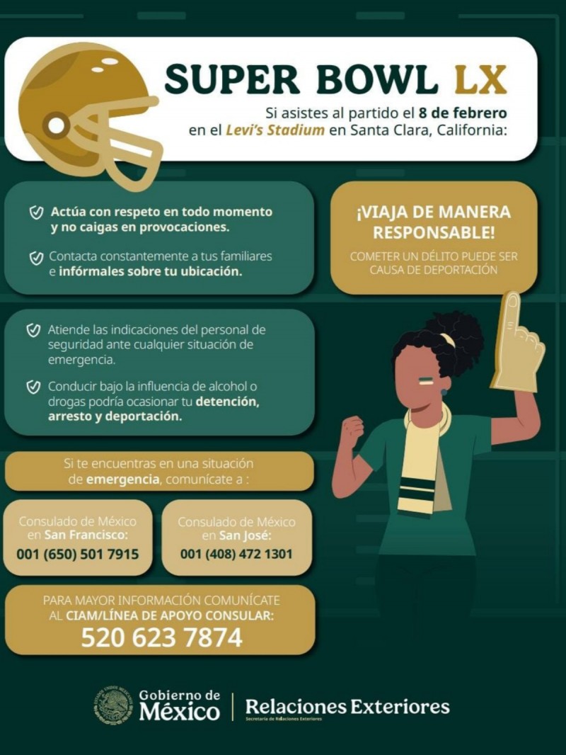A un día de celebrarse el Super Bowl LX en el Levi’s Stadium de Santa Clara, California, la Secretaría de Relaciones Exteriores (SRE) y el Consulado en San Francisco hicieron un atento llamado a los connacionales que viajan para dicho evento de la NFL, instándolos a mantener un comportamiento responsable ante la posibilidad de operativos migratorios por parte del Servicio de Inmigración y Control de Aduanas de EE.UU.(ICE en inglés).