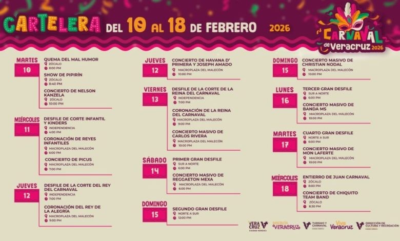 Del 10 al 18 de febrero, la ciudad de Veracruz se llena de color, música y tradición con las coronaciones, desfiles emblemáticos y grandes espectáculos en el Zócalo y la Macroplaza del Malecón.