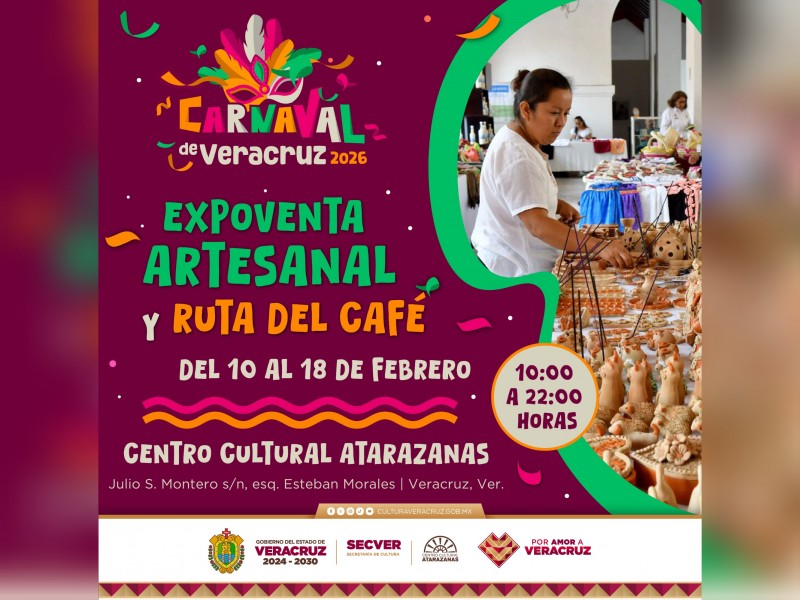La Secretaría de Cultura de Veracruz (SECVER) invita a la Expoventa Artesanal y Ruta del Café en el Centro Cultural Atarazanas, con motivo del Carnaval de Veracruz, a partir de mañana 10 y hasta el miércoles 18 de febrero. La entrada es gratuita.