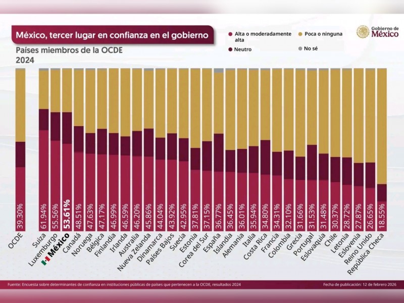 De acuerdo con los resultados del organismo internacional, México se ubica únicamente por debajo de Suiza y Luxemburgo, superando al resto de las economías que integran la organización. Este indicador mide la percepción de los ciudadanos sobre la fiabilidad, integridad y capacidad de respuesta de sus gobiernos y organismos públicos.